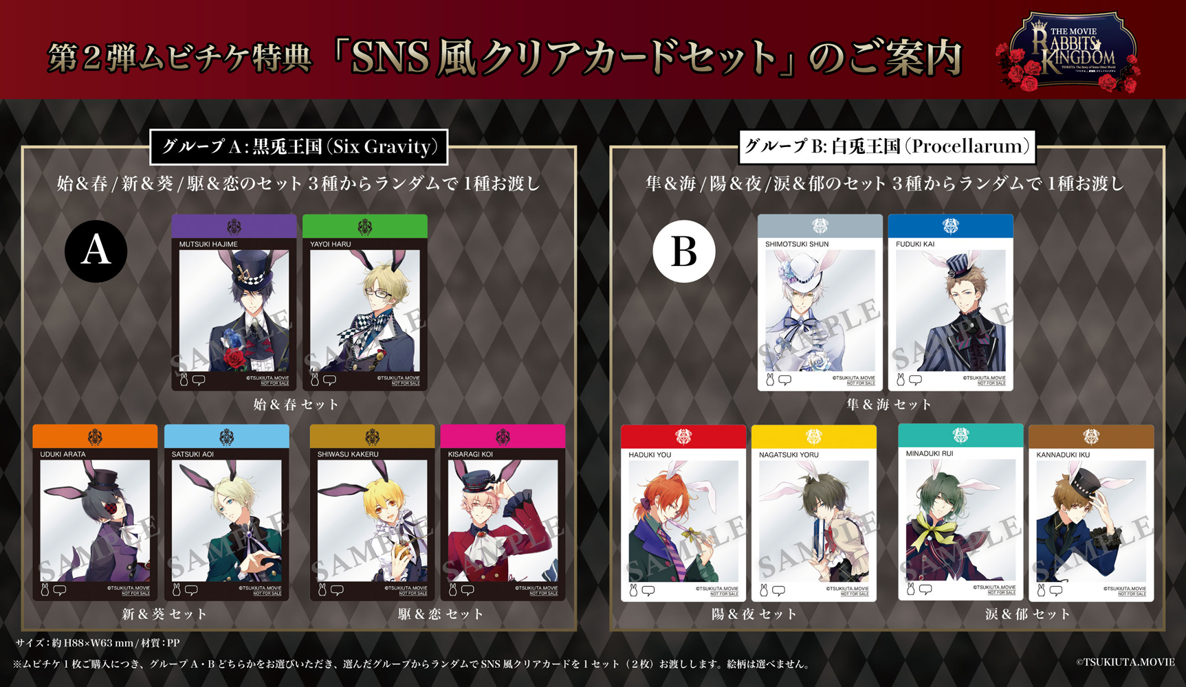 特典のお渡しについて:ムビチケ1枚をご購入につき、グループA・Bどちらかをお選びいただき、選んだグループからランダムでSNS風クリアカードを1セット(2枚)お渡しします。絵柄をお選びいただくことはできません。